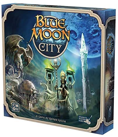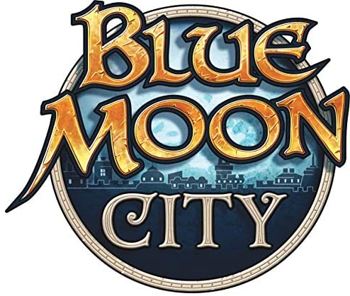 Blue Moon City - the board game - picks up where the two-player game, (Blue Moon), ended: the reconstruction of the destroyed city of Blue Moon. The board, illustrated by Franz Vohwinkel as well as many well-known American fantasy artists, consists of 21 large building tiles, which show building plans on one side and the buildings in their reconstructed glory on the other. As in the 2-player game, the game includes 3 large molded plastic dragons.