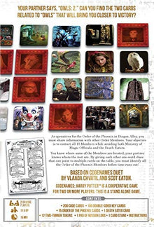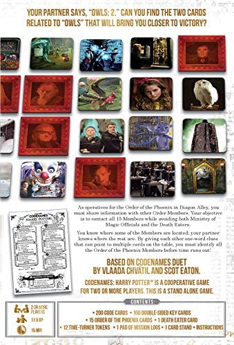 CODENAMES: Harry Potter is a fun, easy-to-learn cooperative word and picture deduction game for Harry Potter fans of all game levels. Based on Codenames Duet, players help their teammates locate secret Agents who are concealed among a grid of Harry Potter references. Use only one-word clues to guide guessers to the right spots, or hidden Death Eaters will cost them the win.