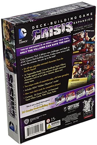 The DC Universe is in peril...again! In the DC Comics Deck-building Game Crisis Expansion Pack 3, you will face some of the most epic challenges, events, and destructive forces in the history of comic-dom. In this Crisis Expansion you will find 14 "Impossible Mode" Crime Syndicate Super-Villains to battle against and Crisis versions of EIGHT oversized characters such as Lex Luthor, Sinestro, Bane and many more. But you'll also find six new playable oversized characters and new main deck cards for competitive players.