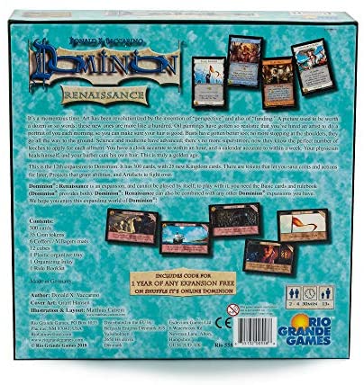 This is the 12th expansion to Dominion. It has 300 cards, with 25 new Kingdom cards. There are tokens that let you save coins and actions for later, Projects that grant abilities, and Artifacts to fight over.