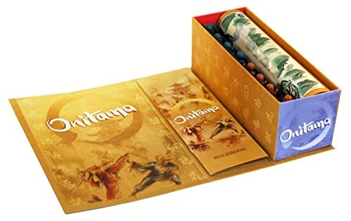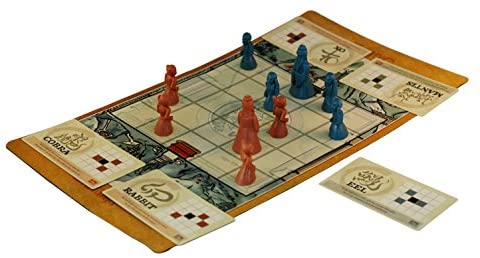 Onitama is a two-player, perfect information abstract game with a random starting set-up. On a 5x5 board, both players start with five pawns on their side, with the main pawn in the middle.