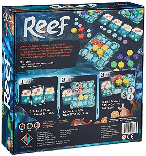 In the game Reef, players take on the role of a coral reef, carefully selecting colors and patterns in which to grow and expand. On each turn, players can choose to pick up a new card from a choice of four, or play a card that is already in hand. Each card provides two reef pieces and a pattern that scores points if the existing reef has it (after placing the two new pieces). Whoever has the most points when the reef pieces (or card deck) run out wins!