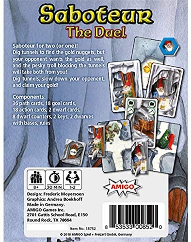 Saboteur: Duel is a standalone version of the famous card game Saboteur for one and two players. When playing alone, you want to collect as much gold as possible by digging new tunnels in the mine; when playing with an opponent, you'll just want to collect more than that player, but naturally your opponent will try to block your progression by all means.