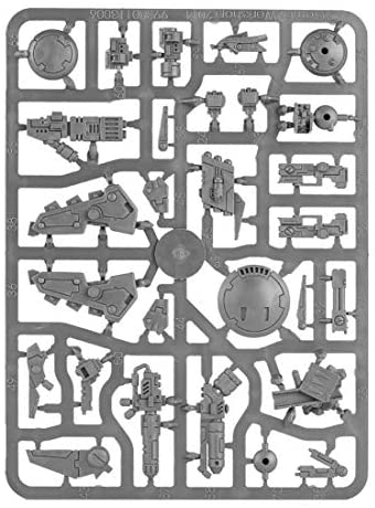 This multi-part plastic kit gives you everything you need in order to build one T 'au Commander, in either an XV-85 Enforcer Armor Crisis Battle suit or an XV86 Cold star Battle suit. There's an immense number of options available in the box - different heads, engines, leg and arm assemblies - and a ton of weapons! An airburst frag projector, a plasma rifle, a flamer, a fusion blaster, a cyclic ion blaster, a burst cannon (plus upgrade kit) and a missile pod. Included is a drone, which can be assembled as a gun, shield or marker drone. Seventy-seven components are included, and one Citadel 60mm Round base.