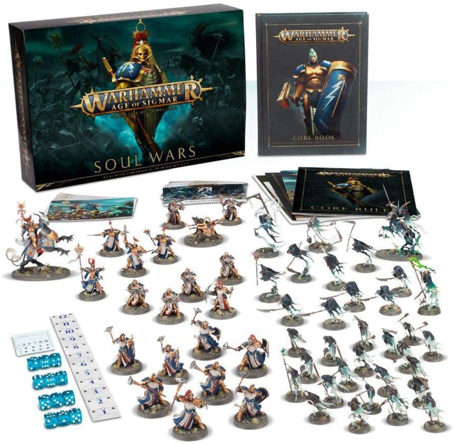 Containing 52 push-fit Stormcast Eternals and Nighthaunt miniatures, along with a 320-page hardback Core Book and an exclusive 32-page Battle of Glymmsforge booklet, Soul Wars is the perfect boxed set for those who want to dive into this exciting new chapter in the Age of Sigmar right away. Included: